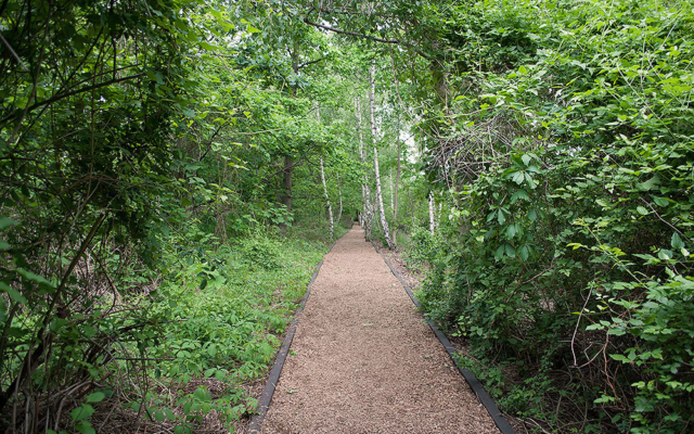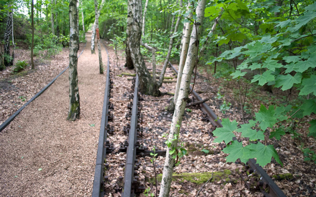 Il percorso più completo conduce attraverso il parco naturale e si estende per circa 3 km. lungo i vecchi binari della ferrovia. Per una passeggiata si impiega circa 1 ora. Il sentiero consiste in una griglia di ferro leggermente rialzata che in parte attraversa e in parte riutilizza la vecchia linea ferroviaria. La griglia permette di proteggere il terreno dal calpestio dei visitatori. Un espediente necessario, dato che nel parco vivono molte specie rare di ragni e crescono oltre 350 varietà di piante e numerosi funghi.